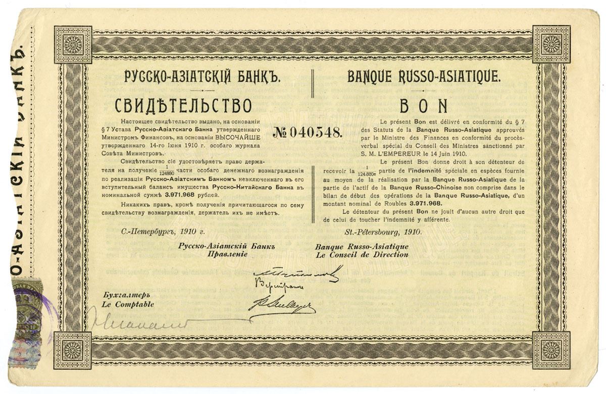 Russia & Friday. China & St. Petersbourg, Russia. 1910, I/U bond, written in Russian and French, for the equivalent of 1/124,880 parts of the monetary value of the Russo-Asiatic Bank. This was issued when the bank was formed in 1910 with a head office in St. Petersburg. Russo-Chinese Bank shareholders received this bon in addition to shares in the newly formed Russo-Asiatic Bank. Also included is a photocopy of a 2-page article detailing the history of the Russo-Chinese and Russo-Asiatic bank and the bonds issued by them. VF.