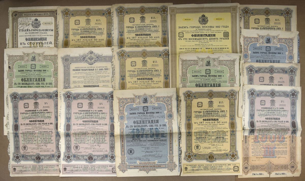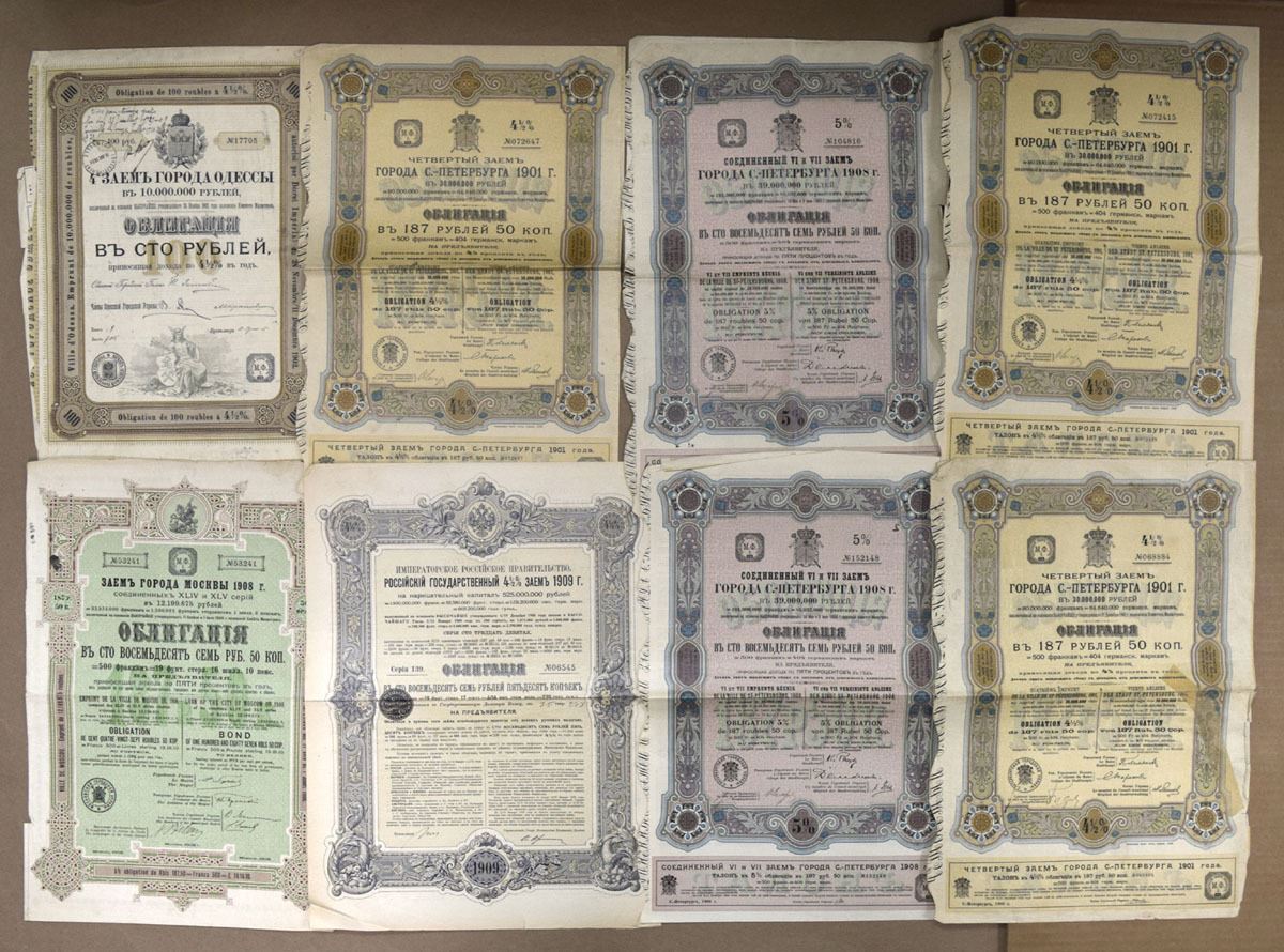 Russia, 1901-12. Lot of 16 Russian City Bonds, Printed in Russian with ornate m/c borders, Certificates range from Good to VF+ condition. (16). Sold "AS IS" no returns accepted.