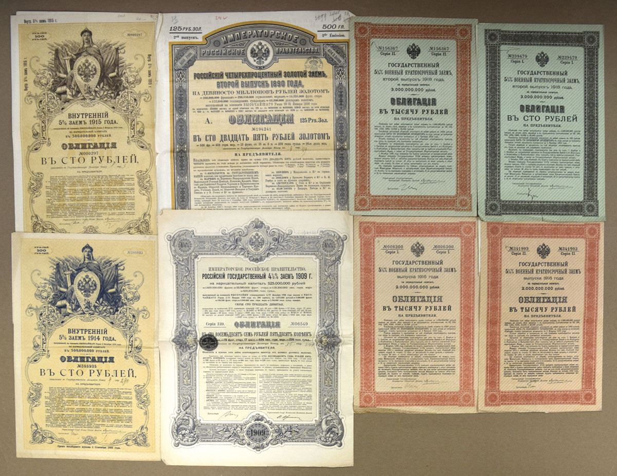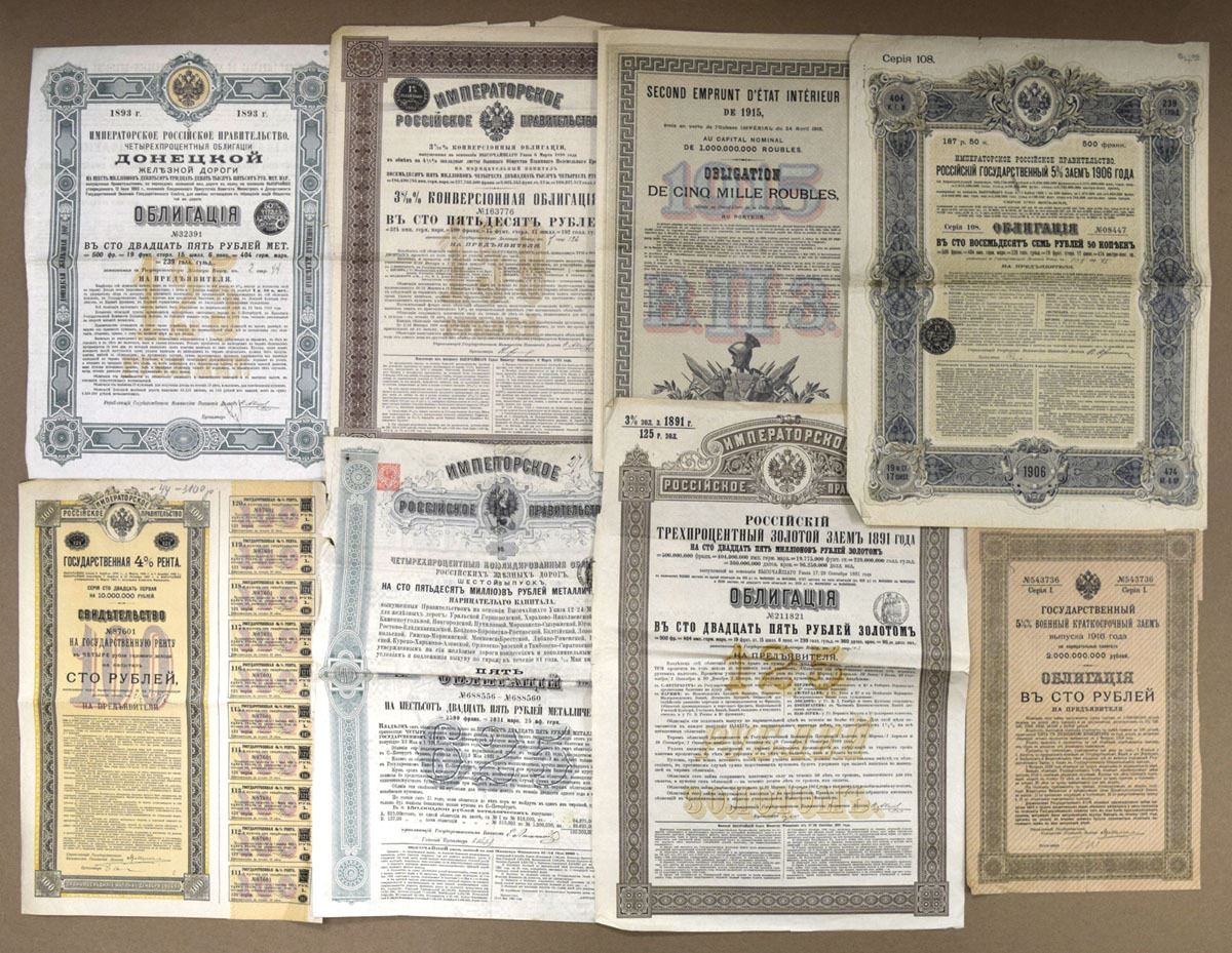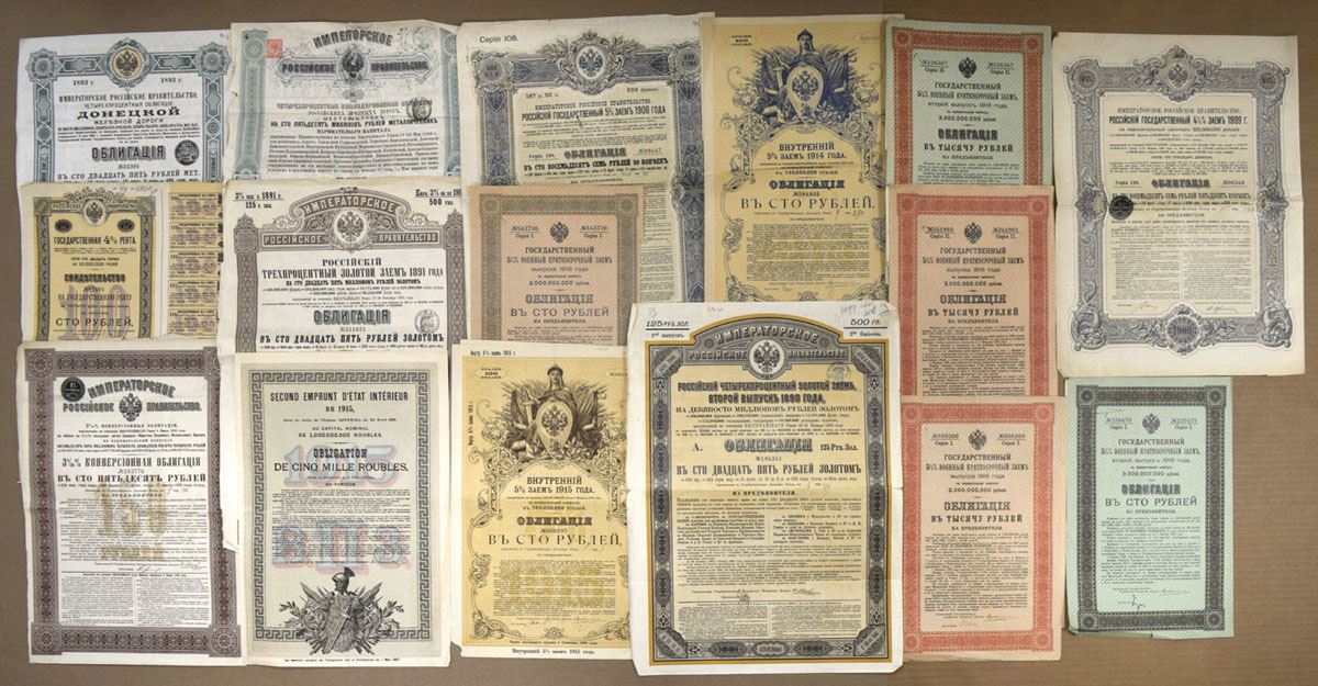 Russia, 1880-1927. Lot of 15 Russian Language Certificates and Bonds, Printed in Russian with ornate m/c borders, Certificates range from Good to VF+ condition. (15). Sold "AS IS" no returns accepted.