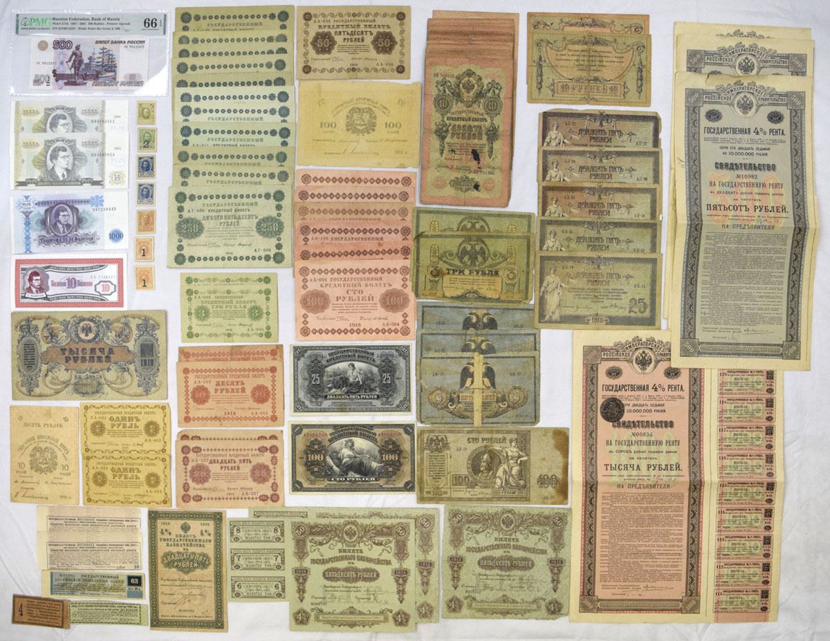 Russia, 1902-97. Lot of 100+ Issued Banknotes from Various Issuers, Includes: National Bank, Ashkabad Branch, 1919, 10 Rubles, P-S1142; 100 Rubles, P-S1145; State Treasury Notes, 1918, 250 Rubles, P-93; Postage Stamp Currency, 1915, 1 Kopek, P-16; 2 Kopeks, P-18; 10 Kopeks, P-21 (2); 15 Kopeks, P-22; 20 Kopeks, P-23; 1 Kopek, P-32; State Treasury Notes and Imperial 4% Rent Bonds dated 1902 to 1917 including 25 Rubles, 1915, P-48; 50 Rubles, 1914, P-52 with 3 coupons; 50 Rubles, 1915, P-53 (2, one with 3 coupons); 500 Rubles, 1902 Rent Bonds (3, each with 4 coupons attached); 1000 Rubles, 1902 Rent Bond with 24 coupons attached; Government Credit Notes, 1918, 25 Rubles, P-39Ab; 100 Rubles, P-40a; Additional State Treasury Notes, 1918: 1 Ruble, P-86 (2); 3 Rubles, P-87 (2); 10 Rubles, P-89 (2); 25 Rubles, P-90 (2); 50 Rubles, P-91; 100 Rubles, P-92 (6); 250 Rubles, P-93 (2); Russian Government Bank, 1918: 3 Rubles, P-S409a (2); 5 Rubles, P-S410a and P-S410b (2); 10 Rubles, P-S411a and P-S411b; 25 Rubles, P-S412a (2) P-S412b (3); and 100 Rubles, P-S413; Bank of Russia, 1997, 500 Rubles, P-271b, PMG graded Gem Uncirculated 66 EPQ; and more. Notes range from Good to XF condition. (100+). Sold "AS IS" no returns accepted.