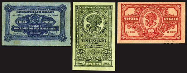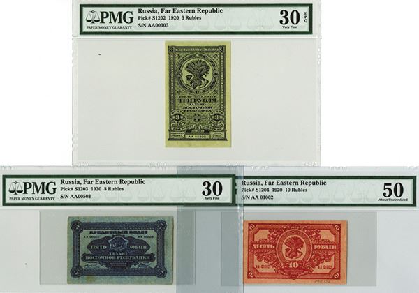 Russia, 1920, Lot of 3 notes, All PMG graded, Includes 3 Rubles, P-S1202, PMG graded Very Fine 30 EPQ; 5 Rubles, P-S1203, Very Fine 30; 10 Rubles, PP-S1204, About Uncirculated 50, Attractive assortment of scarcer varieties.