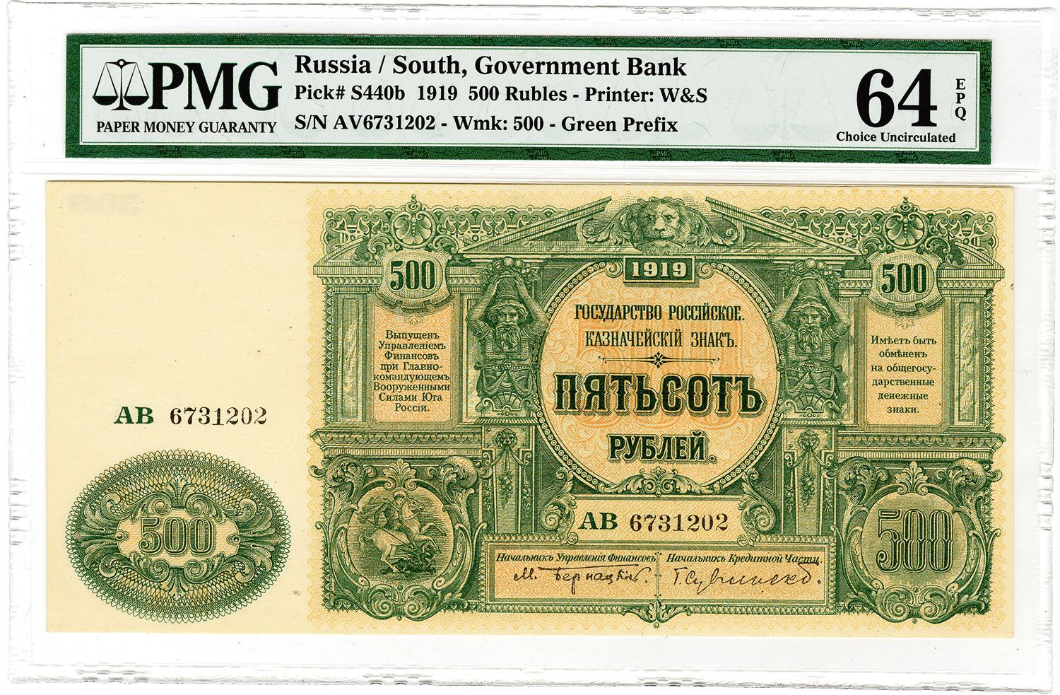 Russia - South. 500 Rubles, 1919, P-S440b. Issued banknote, green on orange underprint. St. George on horseback at lower left center, lion head at upper center. Back shows helmeted woman's head at center. PMG graded Choice Unc 64 EPQ. (Cert # 5003603-019). W&S.