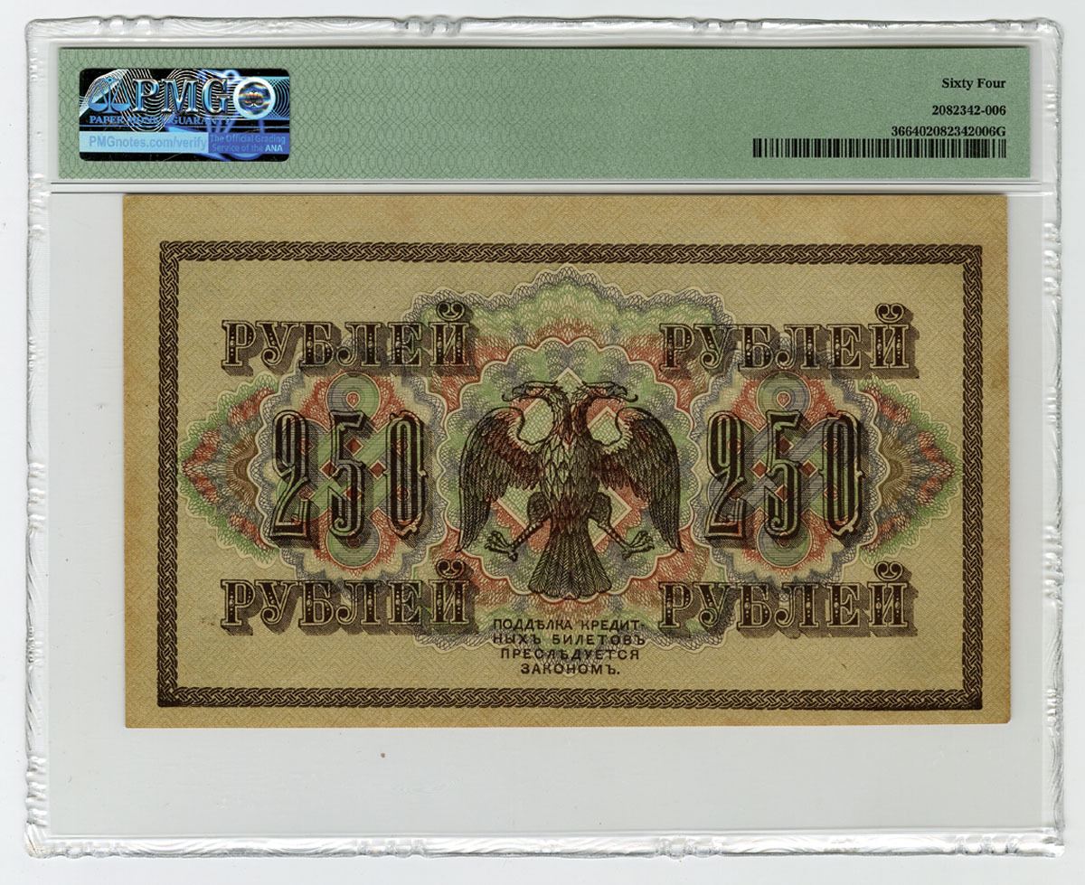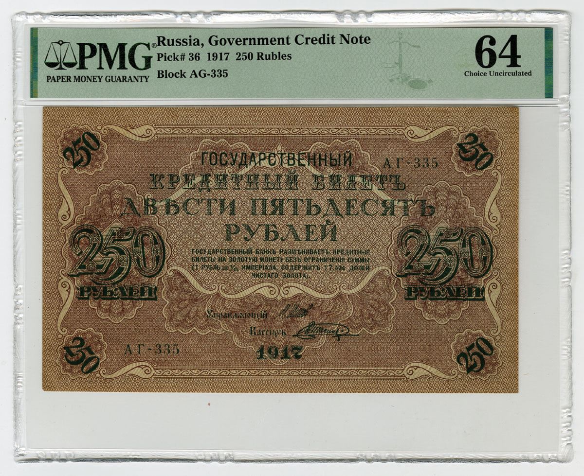 Russia, 1917. 250 Rubles, P-36, Issued Banknote, Dark green on brown underprint, Block AG-335, PMG graded Choice Uncirculated 64.