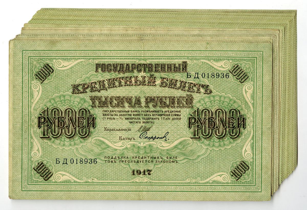 Russia, 1917. 1000 Rubles, P-37 (40), Group of Issued Banknotes some with Sequential S/Ns, Dark brown on green underprint, Swastika in underprint at center, Back is blue on light brown and m/c with Duma building at center, Condition ranges from VF to XF+. (40). Sold "AS IS" no returns accepted.