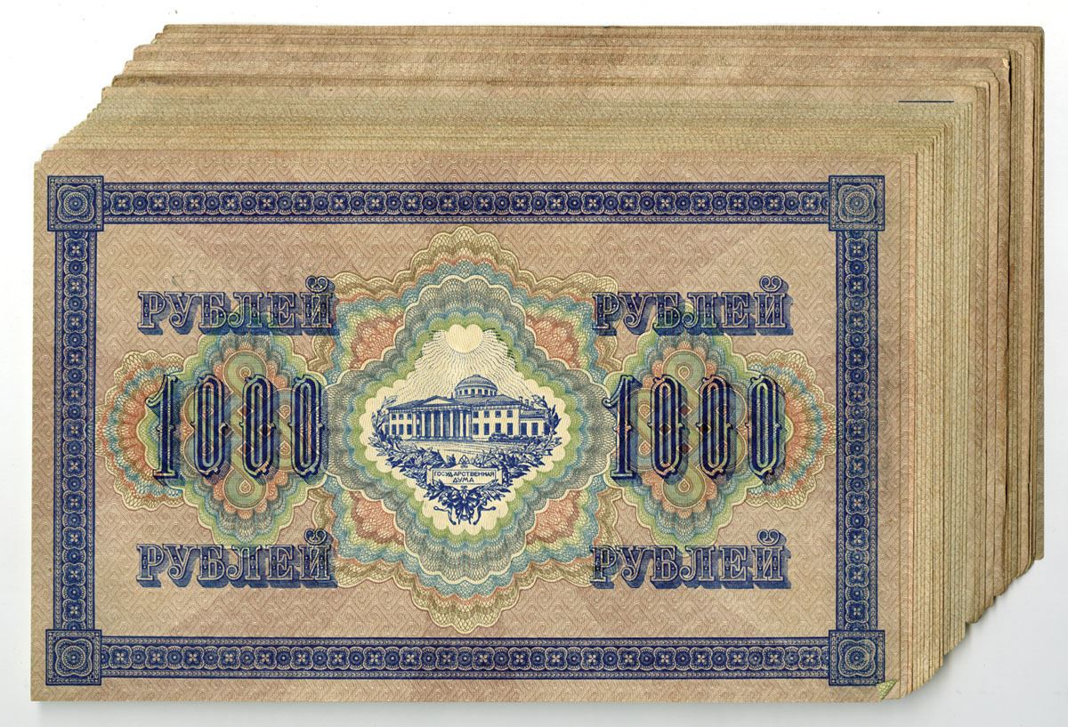 Russia, 1917. 1000 Rubles, P-37 (40), Group of Issued Banknotes some with Sequential S/Ns, Dark brown on green underprint, Swastika in underprint at center, Back is blue on light brown and m/c with Duma building at center, Condition ranges from VF to XF+. (40). Sold "AS IS" no returns accepted.