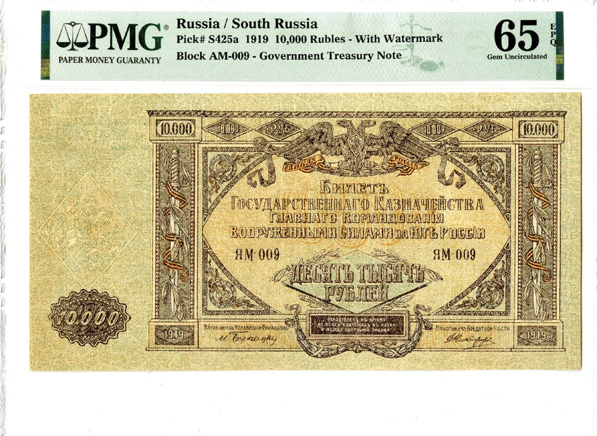 Russia - South Russia, 1919. 10,000 Rubles, P-S425a, Issued banknote, Brown on green and dull orange underprint, Double eagle at top center, Back is brown and orange with women flanking double headed eagle at center, Block AM-009, PMG graded Gem Uncirculated 65 EPQ.