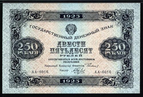 Russia. 1923, 250 Rubles, P-162, Issued banknote, Dark blue on m/c, small Arms in center, back blue on m/c, S/N AA-6016, Tile Pattern Watermark. PMG graded "65 Gem Uncirculated - EPQ (Exceptional Paper Quality", Belyaev Signature. Rarely found this nice and difficult to improve upon for this issue.