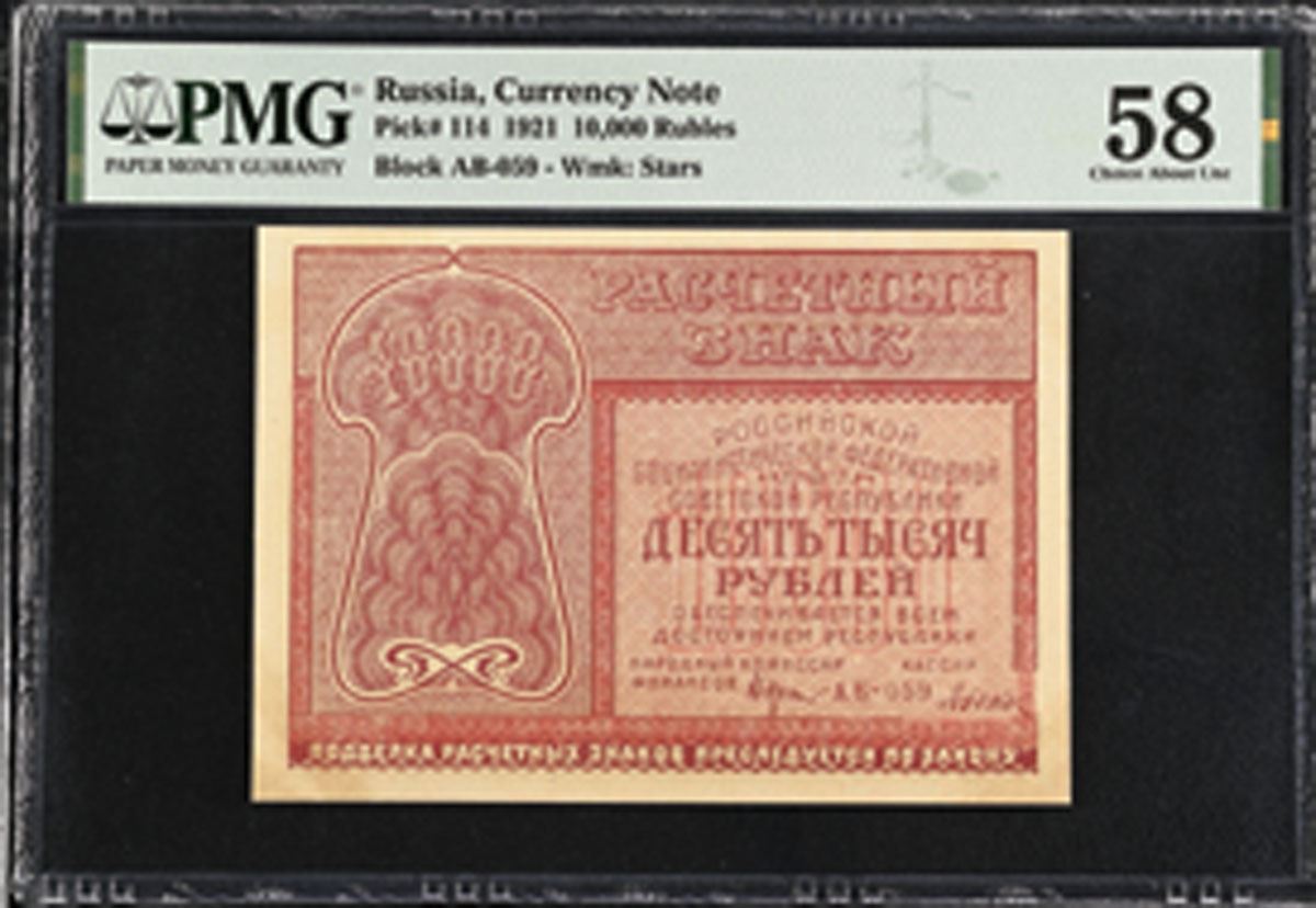 Russia, 1921. 10,000 Rubles, P-114, Issued Banknote, Dark red on light red underprint, Back is red and blue with arms at center, Block AB-059, PMG graded Choice About Uncirculated 58 with comment "Previously Mounted."