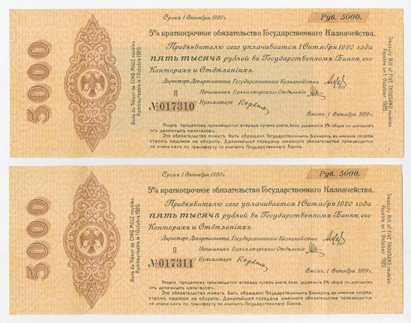 Russia, two issued 5000 Ruble circulating bonds, P-S823, featuring crownless double headed eagle, dated October 1, 1918. Choice VF to Choice XF.