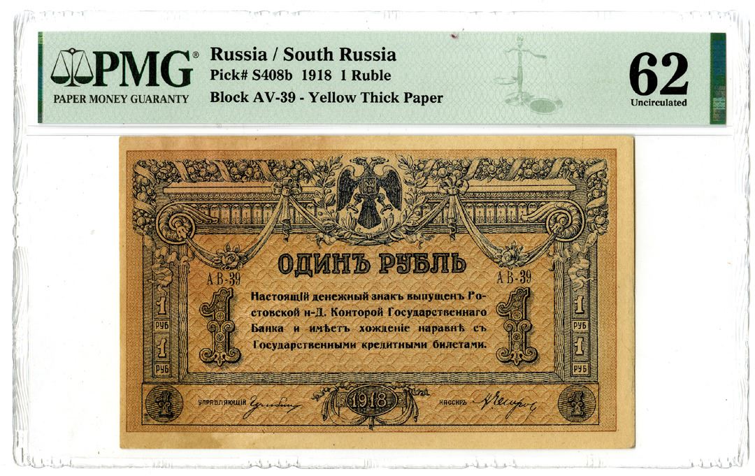 Russia/South Russia. 1918. 1 Ruble, P-S408b, Issued banknote, Blue on brown underprint, Block AV-39 - Yellow Thick Paper, PMG graded Uncirculated 62 with comment "Stained". This is the only graded example in the PMG census.