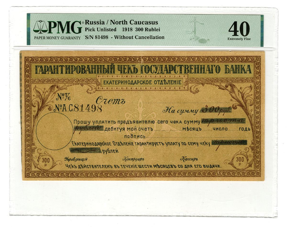 Russia, 1918. 300 Rublei, I/U Guaranteed Check - Scrip or banknote, Unlisted in Pick, Brown on green and olive underprint, Uniface note, Printed in Russian, S/N 81498, p.m. graded Extremely Fine 40 with comment "Tear, Previously Mounted."