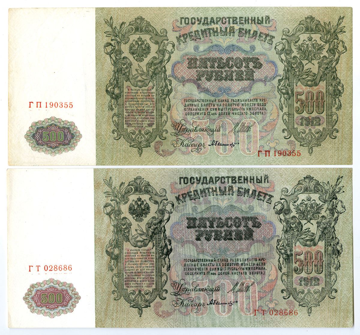 Russia, 1912 (1912-17). 500 Rubles, P-14b (2), Issued Banknote Pair, Black on green and m/c underprint, Back is black and white with Peter I at left, Notes are in AU to Uncirculated condition. (2). Sold "AS IS" no returns accepted.