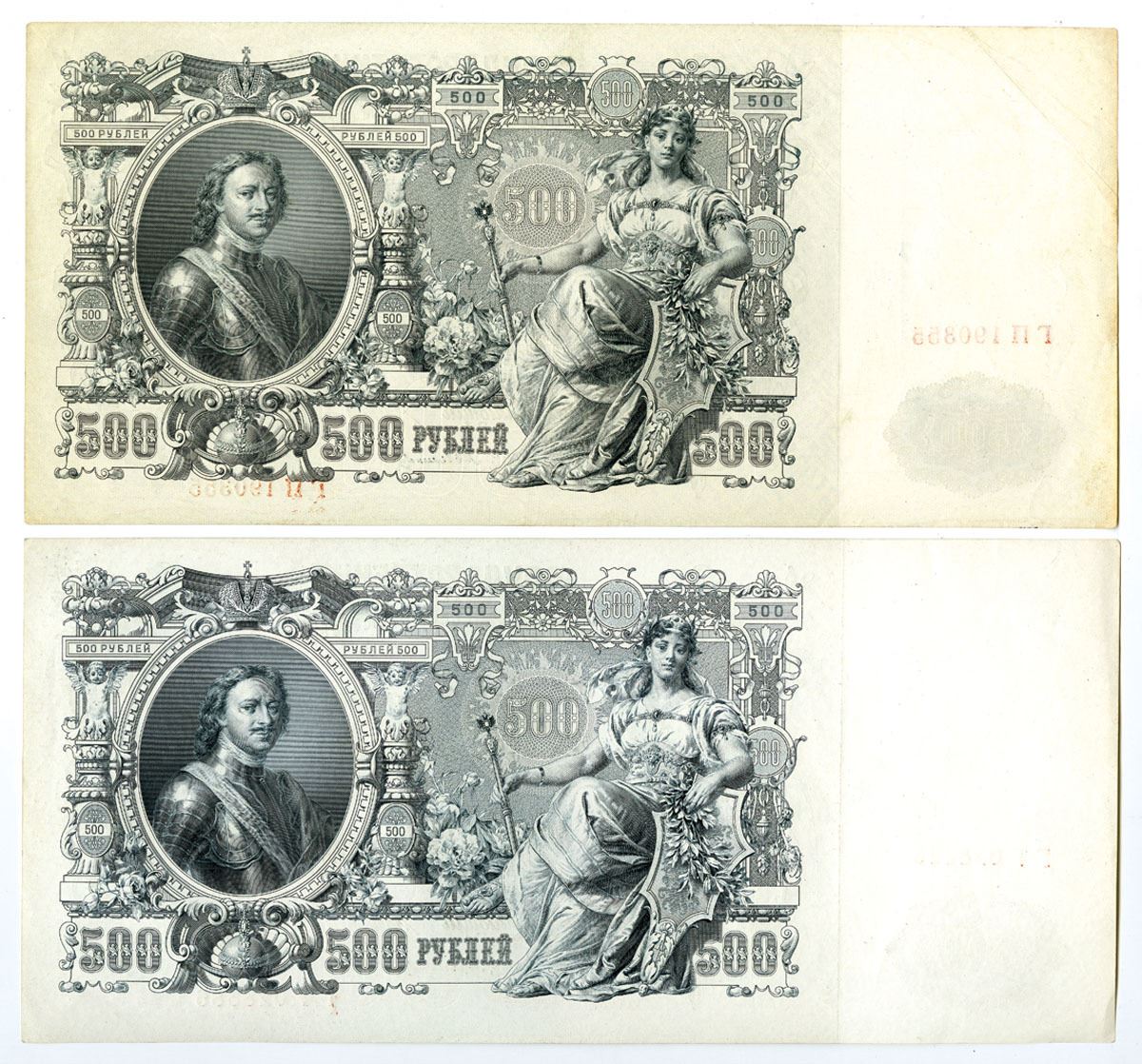 Russia, 1912 (1912-17). 500 Rubles, P-14b (2), Issued Banknote Pair, Black on green and m/c underprint, Back is black and white with Peter I at left, Notes are in AU to Uncirculated condition. (2). Sold "AS IS" no returns accepted.