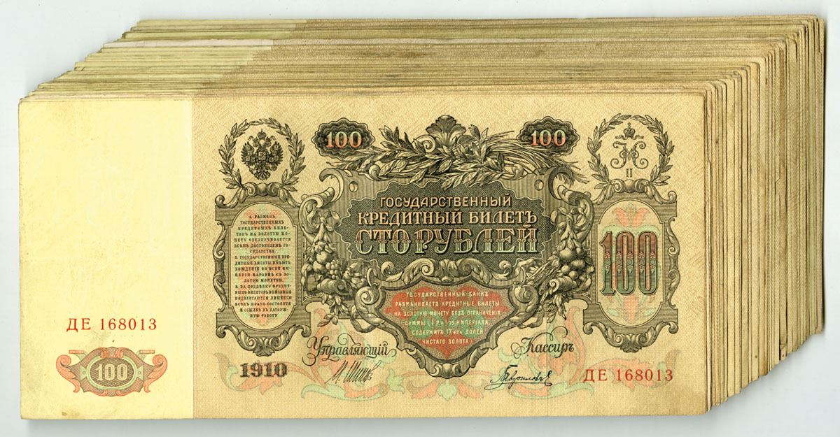 Russia..., 1910 (1912-17). 100 Rubles, P-13b (100), Group of Issued Banknotes some with Sequential S/Ns, Dark brown on light brown and m/c underprint, Back is Back with portrait of Catherine II at left flanked by allegorical man with sword, Notes range from XF to AU condition. (100). Sold "AS IS" no returns accepted.