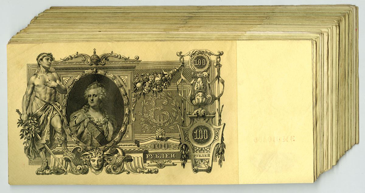 Russia..., 1910 (1912-17). 100 Rubles, P-13b (100), Group of Issued Banknotes some with Sequential S/Ns, Dark brown on light brown and m/c underprint, Back is Back with portrait of Catherine II at left flanked by allegorical man with sword, Notes range from XF to AU condition. (100). Sold "AS IS" no returns accepted.