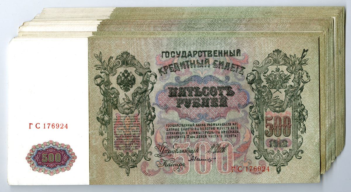 Russia..., 1912 (1912-17). 500 Rubles, P-14b (55), Group of Issued Banknotes some with Sequential S/Ns, Black on green and m/c underprint, Back with Peter I at left and 'Mother Russia' at right, Condition ranges from XF to UNC. (55). Sold "AS IS" no returns accepted.