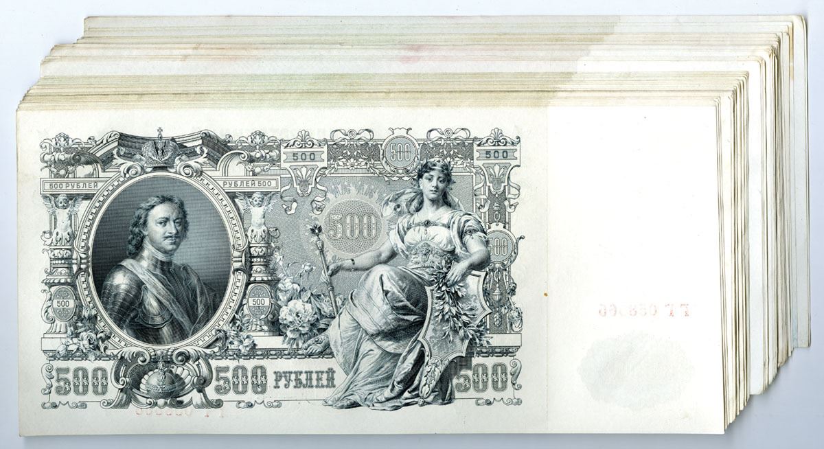 Russia..., 1912 (1912-17). 500 Rubles, P-14b (55), Group of Issued Banknotes some with Sequential S/Ns, Black on green and m/c underprint, Back with Peter I at left and 'Mother Russia' at right, Condition ranges from XF to UNC. (55). Sold "AS IS" no returns accepted.