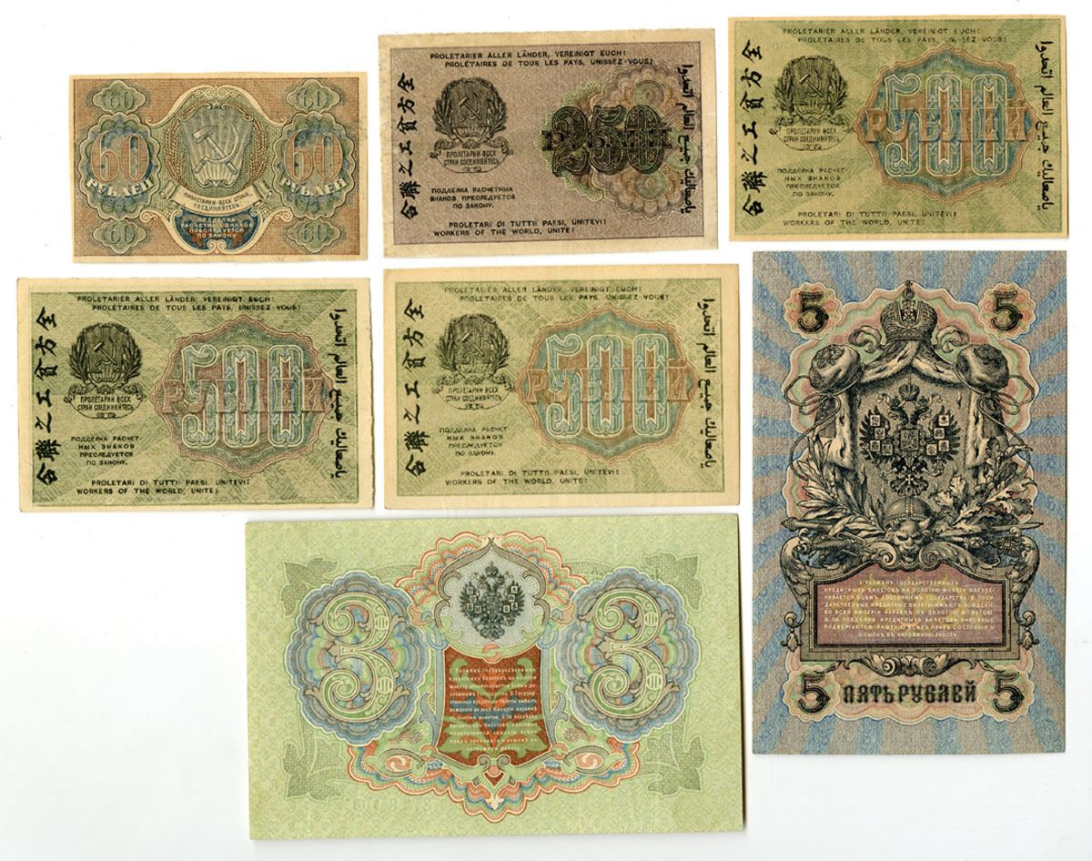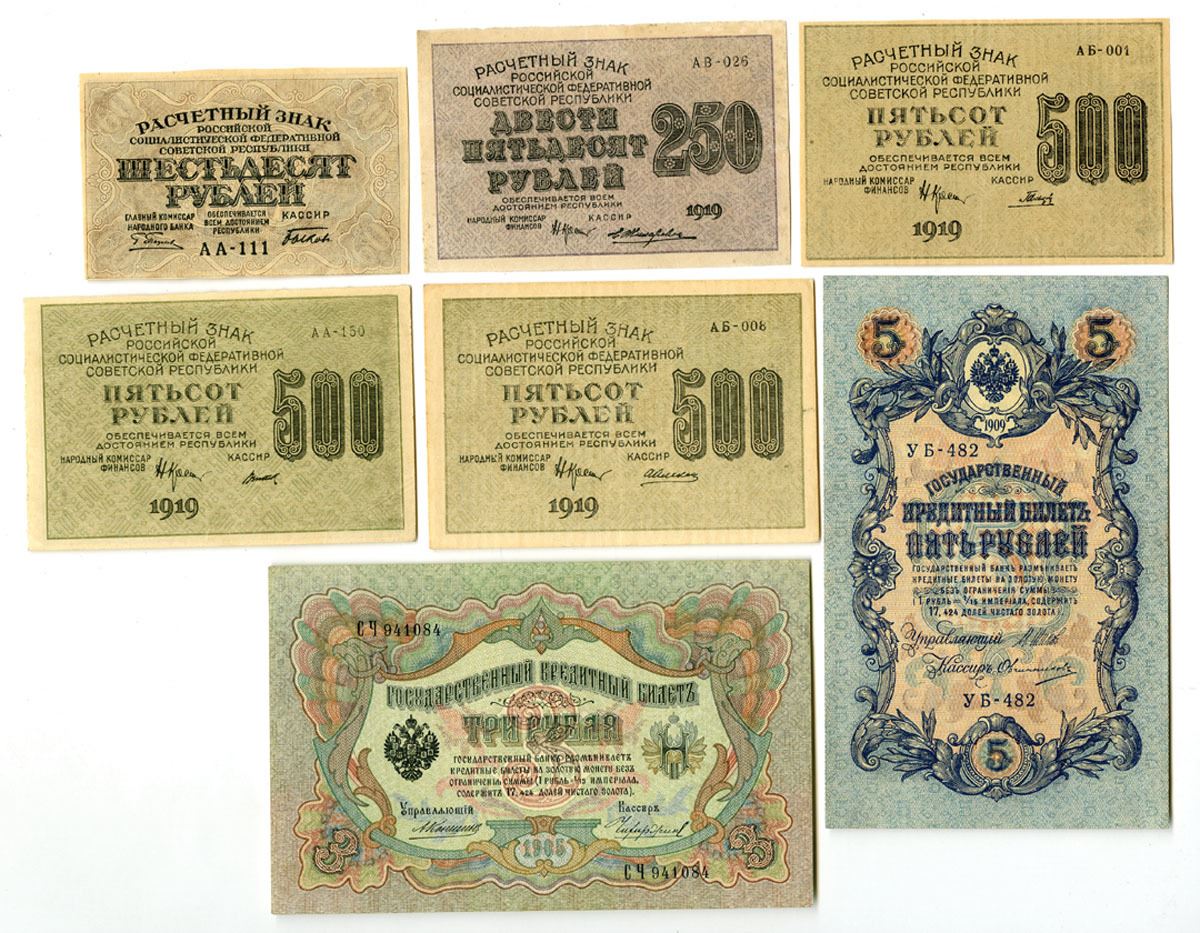 Russia, 1905 (1909-1912)-1919 (1920). Lot of 7 Issued Banknotes, Includes: State Credit Notes, 1905 (1909-1912), 3 Rubles, P-9b; 1909 (1917), 5 Rubles, P-35a; Currency Notes, ND (1919), 60 Rubles, P-100; 1919 (1920), 250 Rubles, P-102a; 1919 (1920), 500 Rubles, P-103a (3). Notes range from XF to AU condition. (7). Sold "AS IS" no returns accepted.