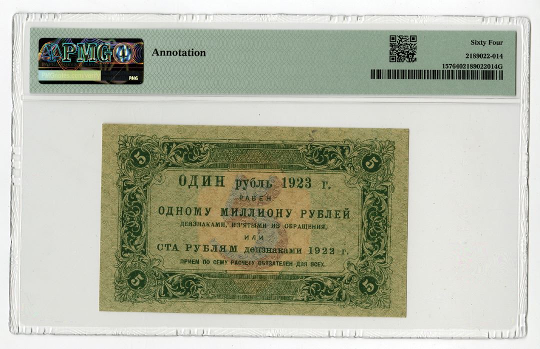 Russia, 1923. 5 Rubles, P-157, Issued Banknote, Dark green on light green underprint, Block AB-1005, PMG graded Choice Uncirculated 64 with comment "Annotation."