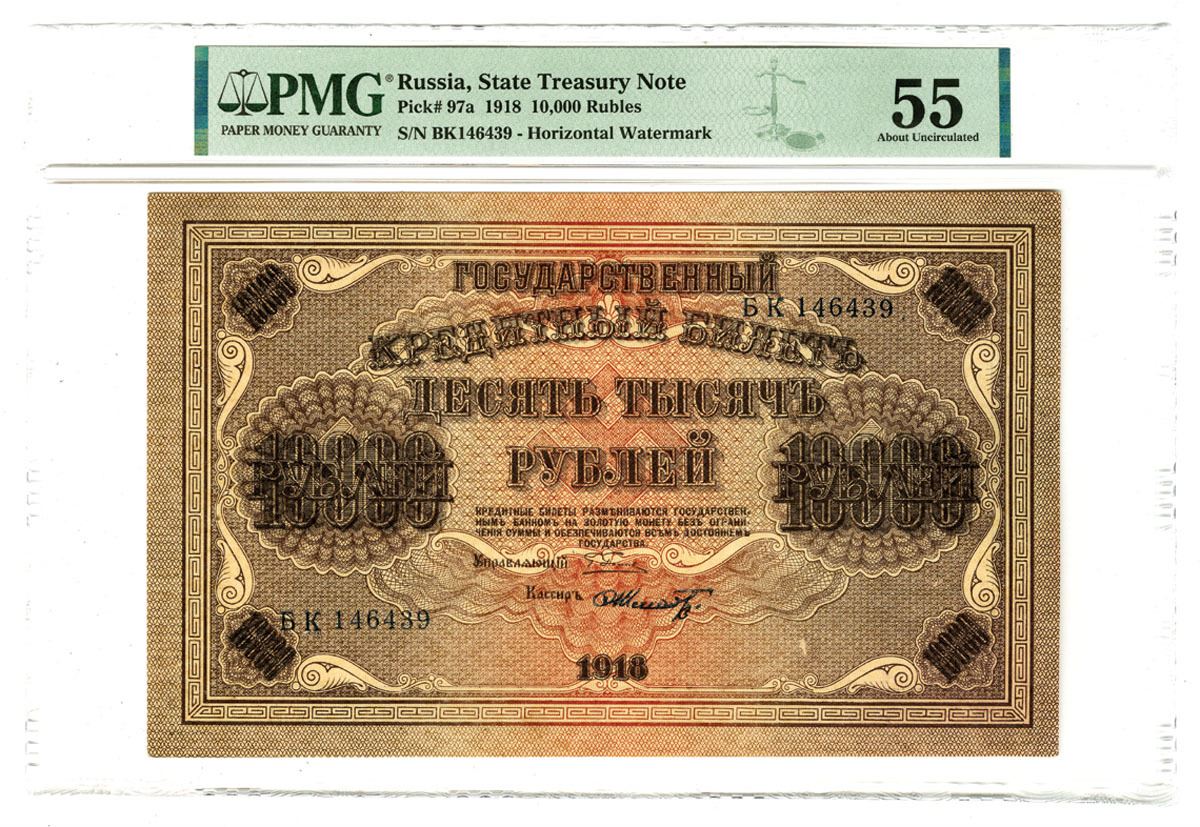 Russia, 1918. 10,000 Rubles, P-97a, Issued Banknote, Brown with red underprint, Back is red with m/c underprint and double headed eagle at center, S/N BK146439, PMG graded About Uncirculated 55.