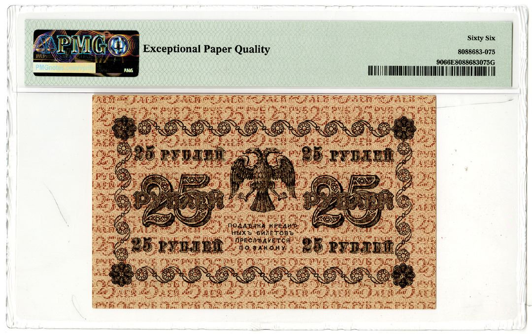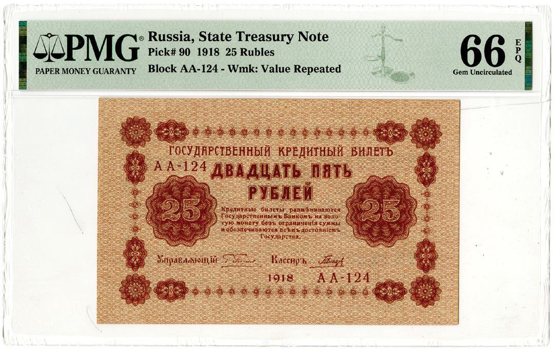 Russia. 1918. 25 Rubles, P-90, Issued banknote, Red-brown on light brown underprint, Block AA-124, Watermark: Value Repeated, PMG graded Gem Uncirculated 66 EPQ. Tied with 3 other notes as highest graded example out of 13 graded in the PMG census.
