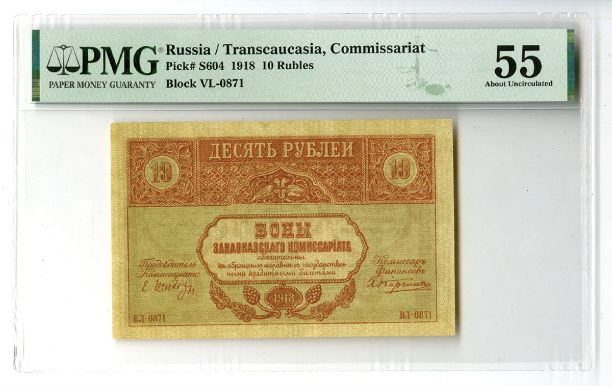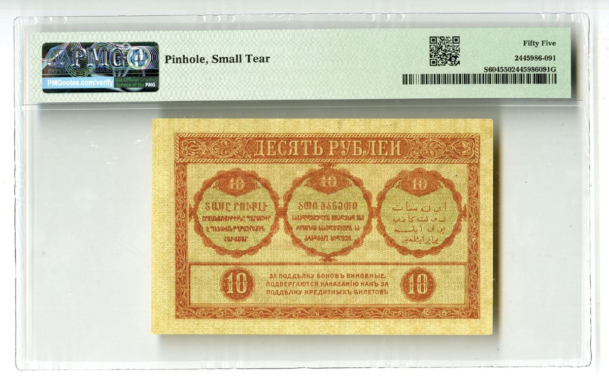 Russia, 1918. 10 Rubles, P-S604, Issued Banknote, Red-brown on olive underprint with company title at top, Back is red on olive with text in three languages, Block VL-0871, PMG graded About Uncirculated 55 with comments "Pinhole, Small Tear."