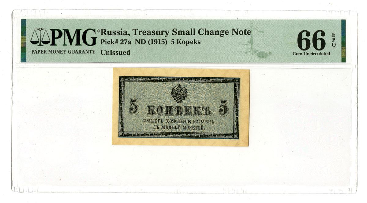 Russia, ND (1915). 5 Kopeks, P-27a, Issued Banknote, Black on blue underprint, Back is black on blue with Double Headed Eagle at center, PMG graded Gem Uncirculated 66 EPQ.