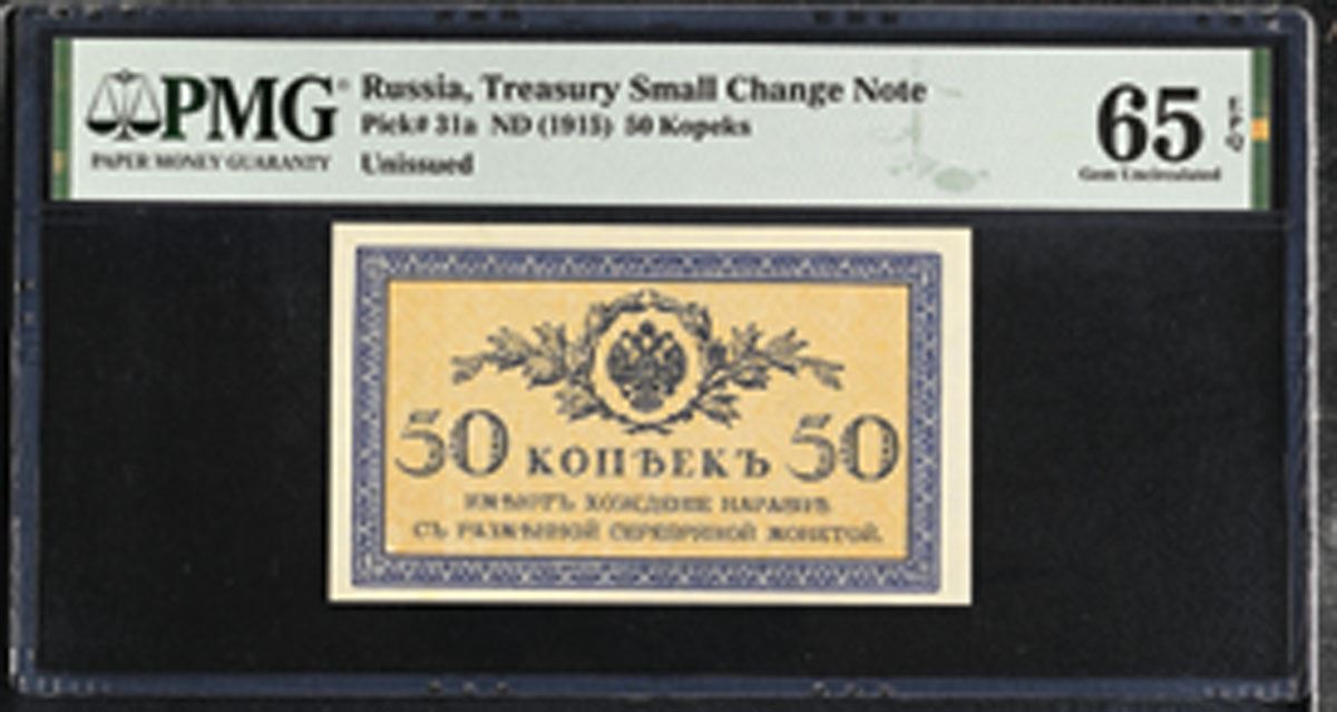 Russia, ND (1915). 50 Kopeks, P-31a, Unissued Banknote, Blue on orange/brown underprint, Back is same color as front, PMG graded Gem Uncirculated 65 EPQ.