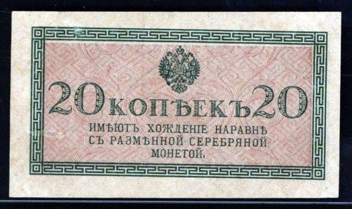 Russia, ND (1915), 20 Kopeks, P-30, green on lilac with arms in middle, Not Issued, PMG graded "55 About Uncirculated", large margins, bright colors and sharp corners only enhance this very conservatively graded note that other than one very light corner fold, would grade Uncirculated to CU condition. Rare and desirable Russian note.