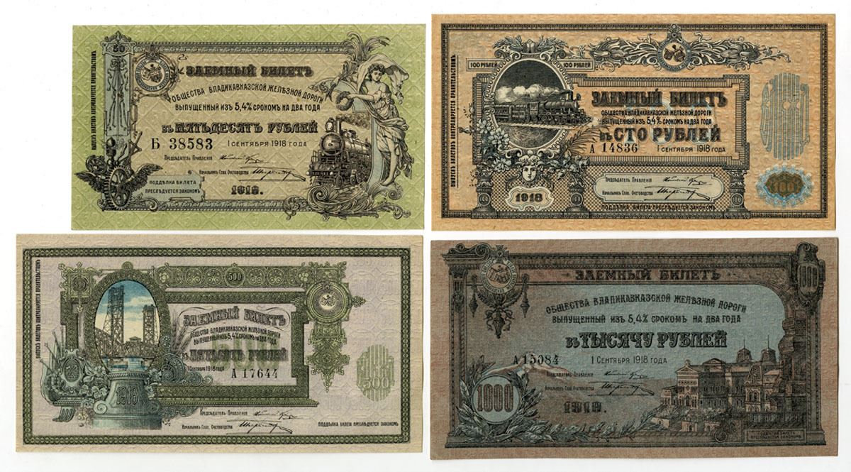 Russia......, 1918. Lot of 4 Issued Banknotes, Includes: 50 Rubles, P-S593, S/N D 38583; 100 Rubles, P-S594, S/N A 14836; 500 Rubles, P-S595, S/N A 17644; 1000 Rubles, P-S596, S/N A 15084. Notes all have the Caucasus map showing railroad's main line from Rostov-on-the-Don to Petrovsky and Baku on reverse, Notes are in Choice XF to AU condition. (4). Sold "AS IS" no returns accepted.