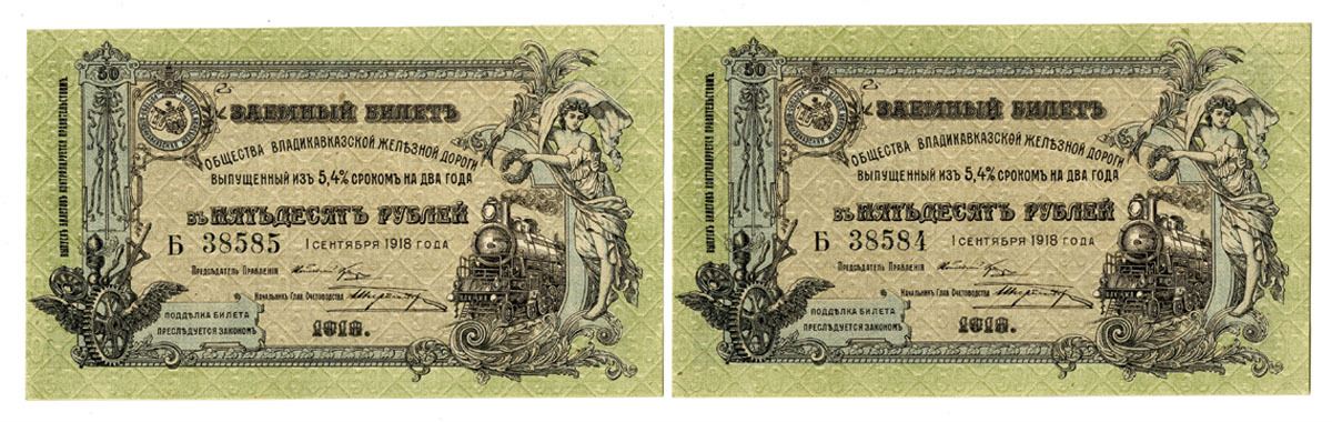 Russia......, 1918. 50 Rubles, P-S593 (2), Sequential Pair of Issued Banknotes, Black on light blue, buff and light green underprint, Winged gear at lower left with steam locomotive below partly dressed woman at right, Back is m/c with Caucasus map showing railroad's main line from Rostov-on-the-Don to Petrovsky and Baku, S/Ns D 38584 and D 38585, Notes are in Choice XF to AU condition. (2).