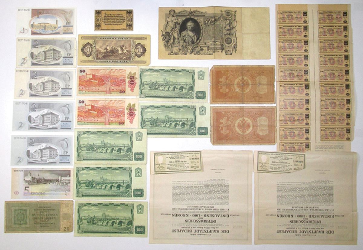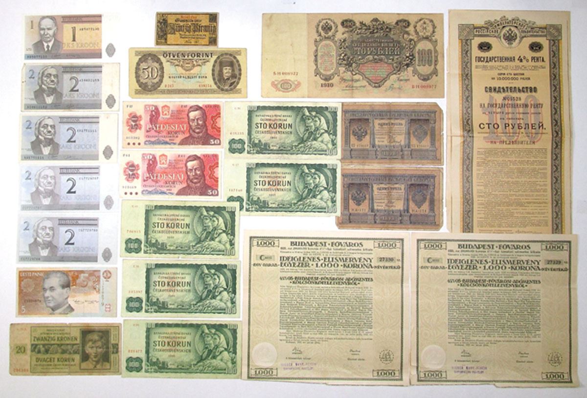 Russia and Eastern Europe, 1898 (1912-17)-1994 (1997). Lot of 22 Issued Banknotes, Includes: Notgeld from City of Nordhausen, 1919; State Treasury Note, 1898 (1912-17), 1 Ruble, P-1d; 1910 (1909-12), 100 Rubles, P-13a; ND (1915 - Old Date 1898), 1 Ruble, P-15; Protectorate of Bohemia & Moravia, 1944, 20 Korun, P-9a; Czechoslovak State Bank, 1961, 100 Korun, P-91b (3) & P-91c (2); 1987, 50 Korun, P-96a (2); Hungarian National Bank, 1986, 50 Forint, P-170g; Bank of Estonia, 1992, 1 Kroon, P-69a; 1992, 2 Krooni, P-70a (2); 1994 (1997), 5 Krooni, P-76a; 2006, 2 Krooni, P-85a (2). Lot also has 2 I/U Bonds from Budapest and Imperial Russian Government I/U Coupon Bond. Notes range from Fine to XF condition. (22). Sold "AS IS" no returns accepted.