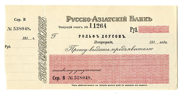 Russia, personal check with pre-printed account holder by the name of Rolf Dowson, city indicated is "Petrograd" which is the former pre-1914 name of St. Petersburg, which was renamed to Leningrad during Soviet times before taking its current name. Amount is left blank as the check is unissued but is denominated in Rubles. Counterfoil at left fully attached and also unused. Uncirculated and unusual.