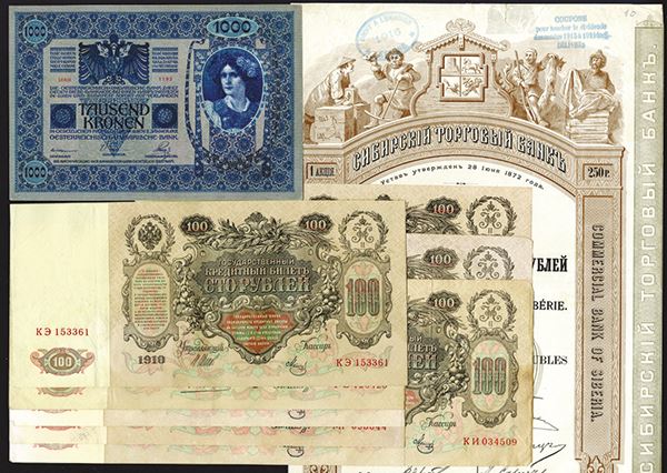 Russia, Lot of 22 different Russian Bonds, highlights include Russian Imperial Banknotes, ca. 1910 (8), mostly VF to XF and on Konshin Signature; Austria-Hungary Bank Note for 100 Kronen; 1905 Commercial Bank of Siberia, 250 R.; 1889 and 1894 Imperial Government of Russia 3% or 4% Gold Loan, 125 R. (2); and various other loans (11). Attractive assortment.