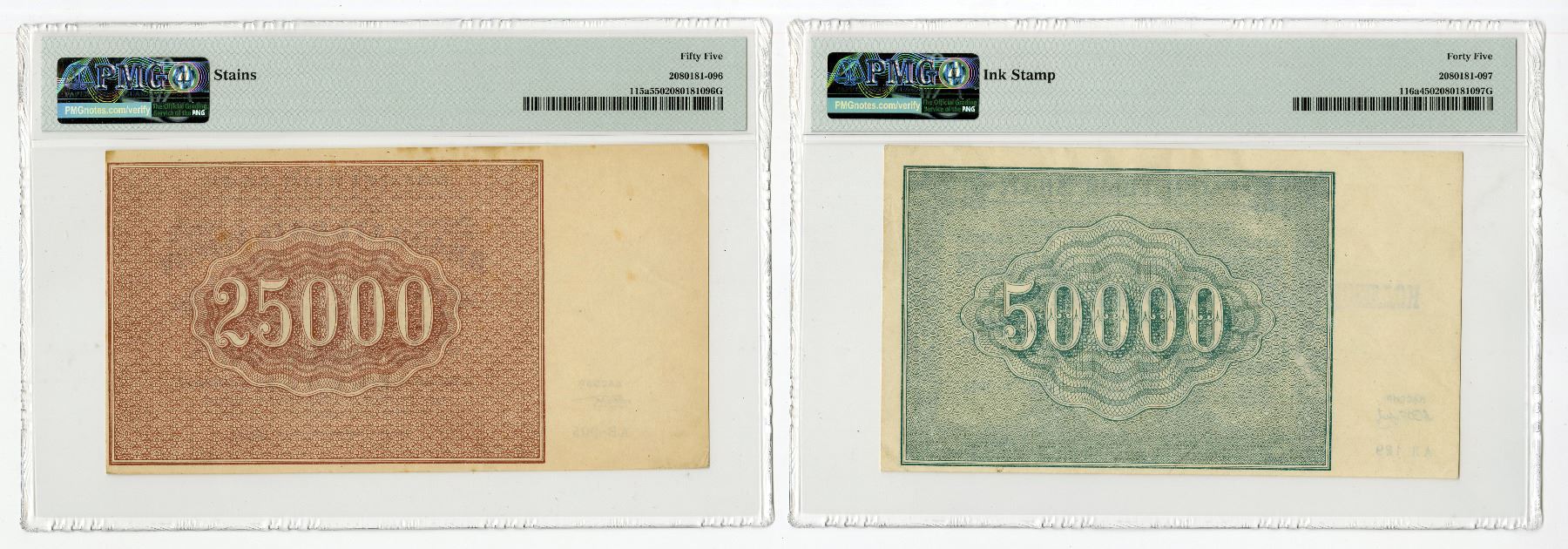 Russia, 1921. Lot of 2 Issued Banknotes, Includes: 25,000 Rubles, P-115a. Block # AV-005. PMG graded About Uncirculated 55 with comment "stains"; and, 50,000 Rubles, P-116a. Block # AL-189. PMG graded Choice Extremely Fine 45 with comment "ink stamp." (2)