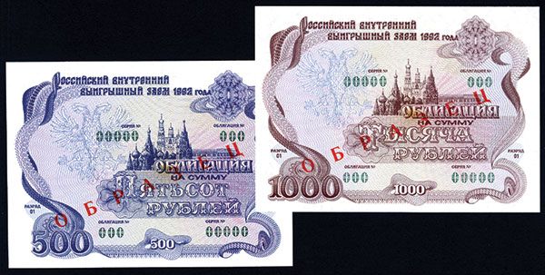 Russia, pair of bond specimens, with zero serial numbers and red '_______' overprints ('SPECIMEN' in Russian). Includes 500 and 100 Rubles. UNC and unusual.