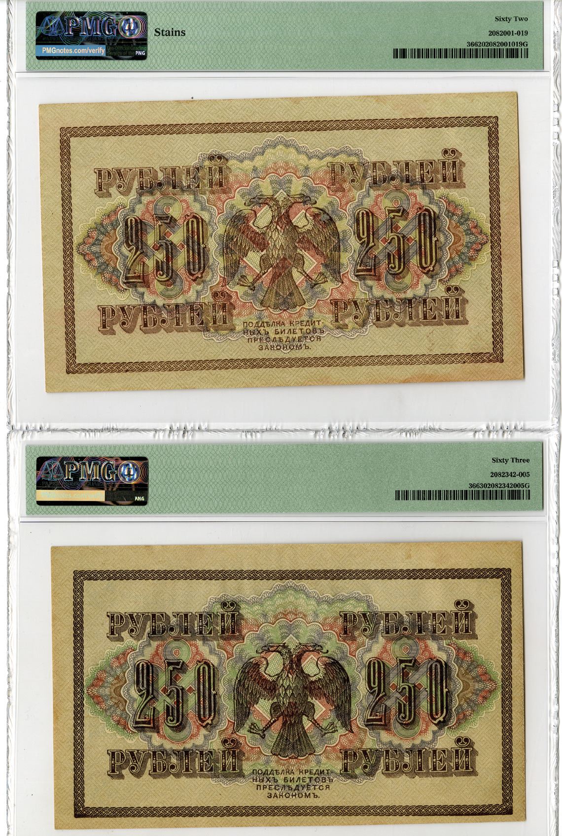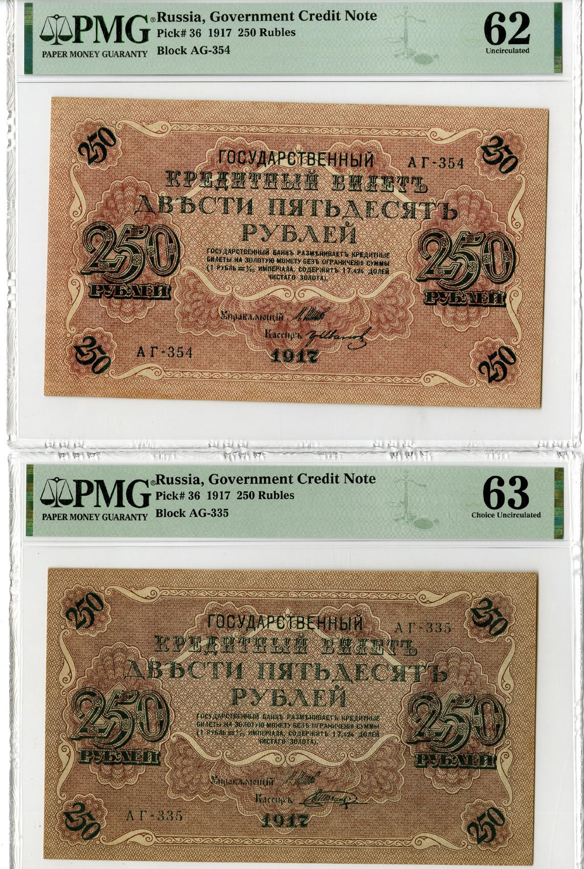 Russia, 1917. 250 Rubles, P-36 (2), Lot of 2 Issued Banknotes, Dark green on brown underprint, Blocks AG-335 and AG-354, PMG graded Uncirculated 62 with comment "Stains" and Choice Uncirculated 63. (2). Sold "AS IS" no returns accepted.