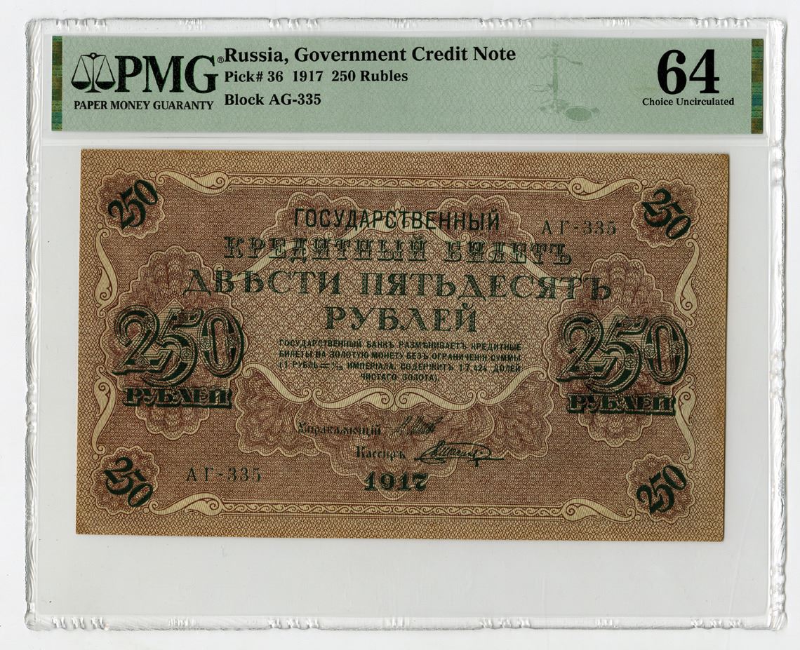 Russia, 1917. 250 Rubles, P-36, Issued Banknote, Dark green on brown underprint, Back is brown on m/c with Double headed Eagle at center with Swastika underprint, Block AG-335, PMG graded Choice Uncirculated 64.