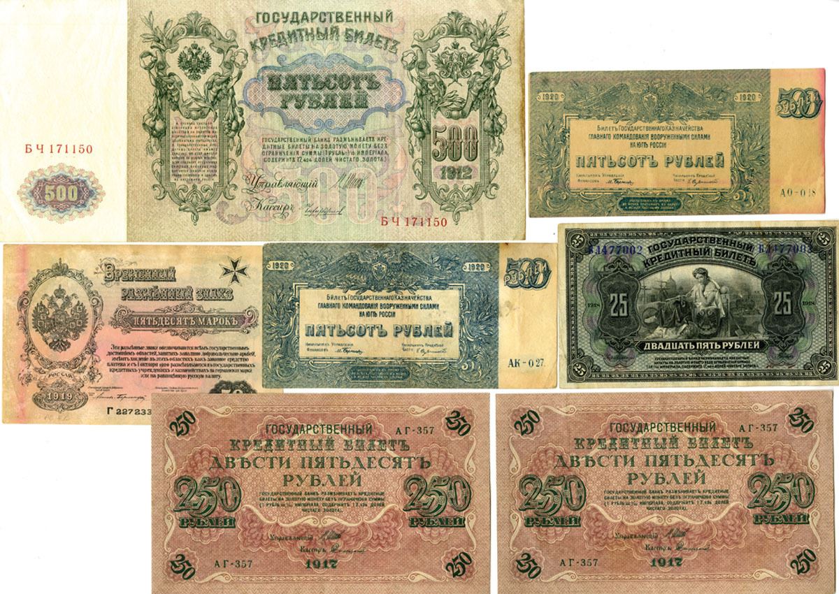 Russia, 1912 to 1920. Lot of 7 Issued Banknotes, Includes: State Credit Notes, 1912 (1912-17), 500 Rubles, P-14b; Government Credit Notes, 1917, 250 Rubles, P-36 (2); 1918, 25 Rubles, P-39Aa; Independent West Army under Colonel Avalov-Bermondt, 1919, 50 Mark, P-S230b; Government Treasury Notes, 1920, 500 Rubles, P-S434 (2). Notes range from Fine to XF condition. (4). Sold "AS IS" no returns accepted.