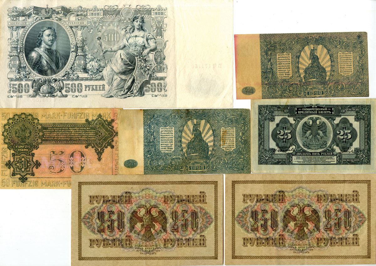 Russia, 1912 to 1920. Lot of 7 Issued Banknotes, Includes: State Credit Notes, 1912 (1912-17), 500 Rubles, P-14b; Government Credit Notes, 1917, 250 Rubles, P-36 (2); 1918, 25 Rubles, P-39Aa; Independent West Army under Colonel Avalov-Bermondt, 1919, 50 Mark, P-S230b; Government Treasury Notes, 1920, 500 Rubles, P-S434 (2). Notes range from Fine to XF condition. (4). Sold "AS IS" no returns accepted.