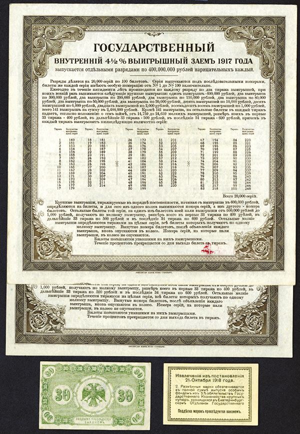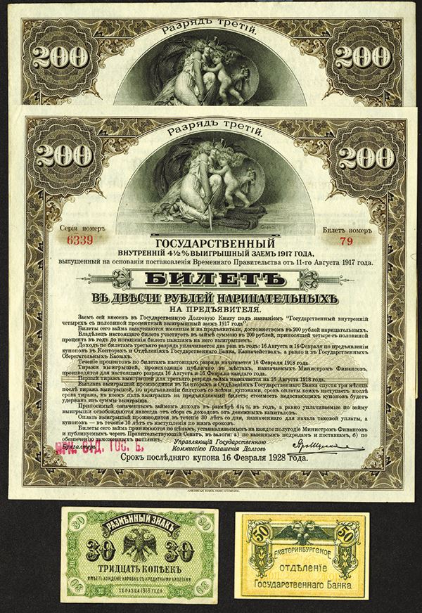 1-2) Russia, Siberia and Urals, 1917, 200 Rubles, S882, brown, woman with child, ABN, both Unc. 3) Ekaterinburg, 1918. 50 Kopeks, S920, double headed eagle, blue on gold, Unc. 3) East Siberia, Far East Provisional Government, 1918, 30 Kopeks, S1243, double headed eagle, green, AU. [3]