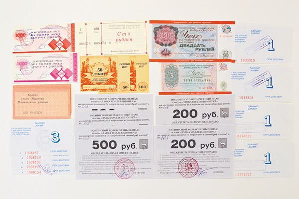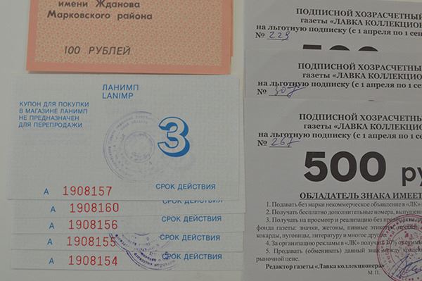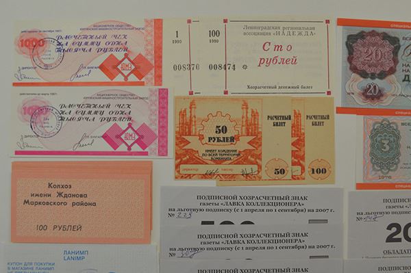 Russia, Lot of 48 pieces, Includes Collective Farm "Zhadanov", Markovsky District, Luhansk Region, Ukraine; Lange pas, Khanty-Mansi, Autonomous Region Coupons for purchase in store "Lanimp; Yurga Machine Building Corp., 1000 Ruble Coupon, ca.1990's; Internal Bank notes Leningrad Regional Association "Ticket may be used for the purchase of goods", and numerous others.