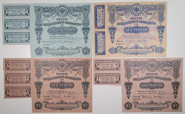 Russia. Lot includes a quartet of State Treasury Notes, including 100 and 500 Ruble notes, all with 4% interest, two with 3 coupons attached and the other two with 2 coupons remaining. P-56; 57; 58; 59. XF. (4)