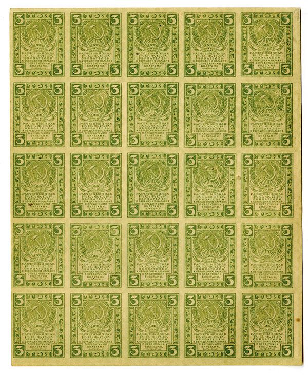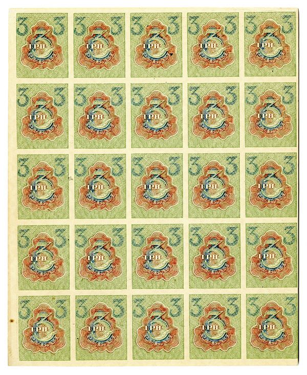 Russia. Uncut partial sheet of 25, 5 Ruble currency notes. P-83. Choice AU to Choice CU. Small spot on lower right.