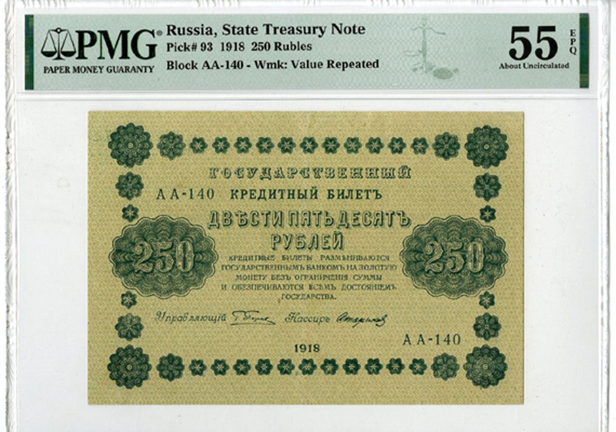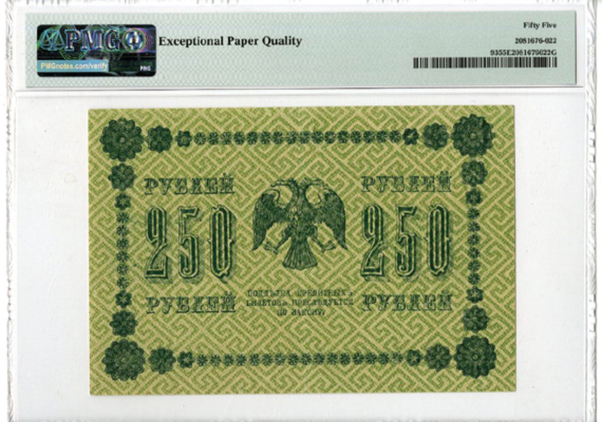 Russia, 1918. 250 Rubles, P-93, Issued Banknote, Dark green on light green underprint, Block AA-140, PMG graded About Uncirculated 55 EPQ.