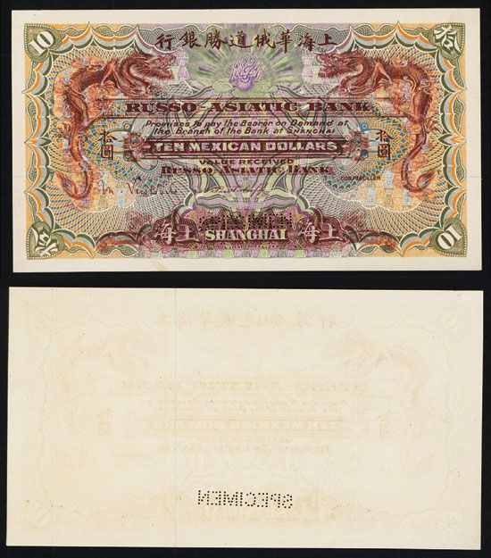 Shanghai, China. ND (1909). 10 Mexican Dollars, P-S543p S/M#O5-42 Uniface Specimen without back, Violet and m/c with facing dragons on top. Pin punch Specimen. No Serial numbers, Amazing and dramatic design with bright and vibrant colors. The note appears Choice Uncirculated but there is light handling and a small 2 to 3 mm tear on the top left and right margins which would leave this lovely note a Choice to Gem AU condition, A trophy banknote for the discriminating collector. BW&C. Rare note only known as Specimen