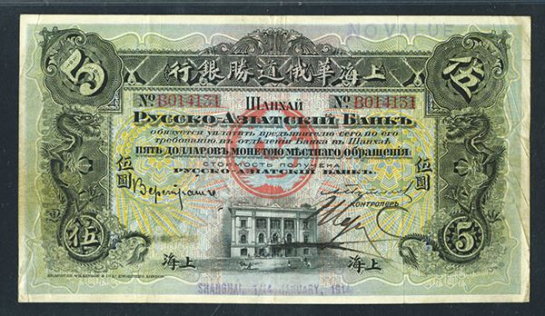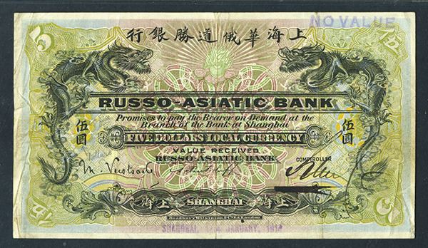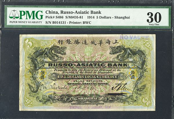Shanghai, China, $5, P-S486, S/M #05-81, Issued, S/N B014131, hand signed, Black on m/c underprint, facing dragons in middle with back with dragons on sides facing,æPMG graded Very Fine 30. æBWC. Only 2 graded in the PMG census, both at this grade. Extremely attractive and rare note.