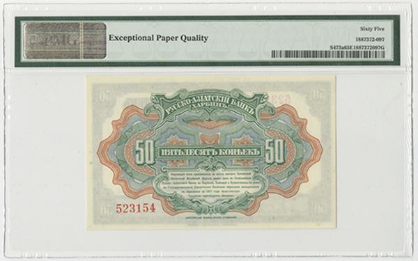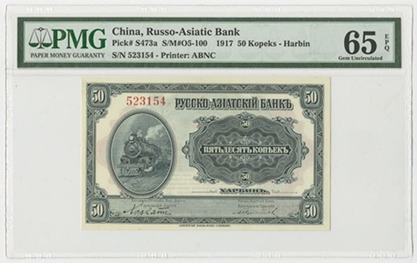 Harbin, China. Issued 50 Kopeks, 1917, P-S473a, S/M#O5-100. PMG graded Gem Unc 65 EPQ. ABNC.