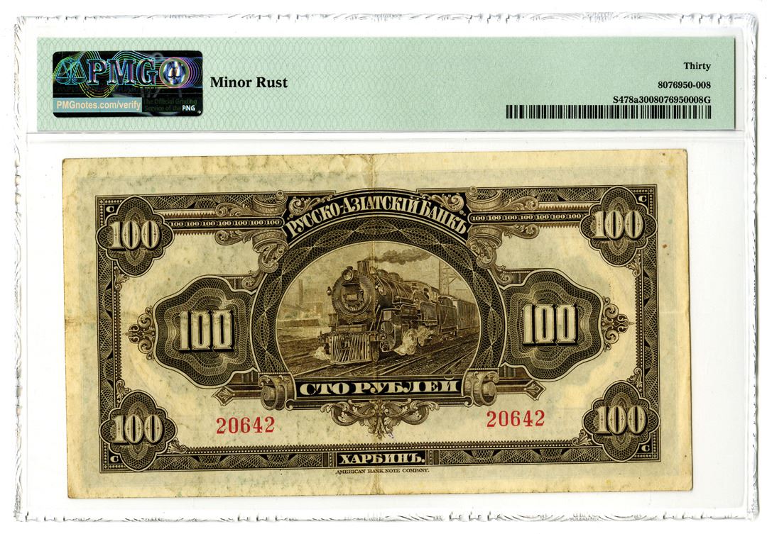 Harbin, China. 1917. 100 Rubles, P-S478a S/M#O5-105, Issued banknote, Dark brown and green on multicolor underprint, S/N 20642, PMG graded Very Fine 30 with comment "Minor Rust". Printer: ABNC. Scarce high denomination note for this series.