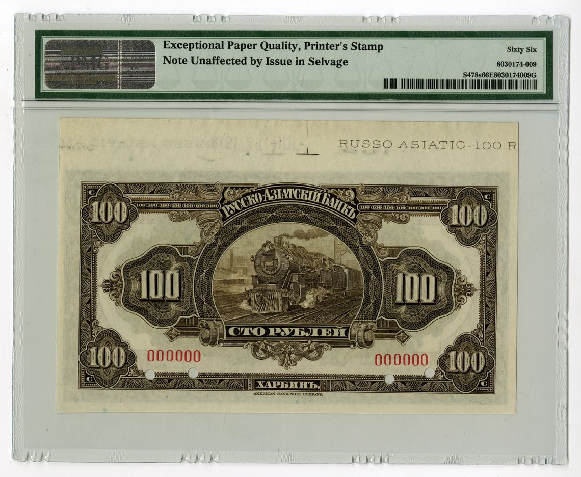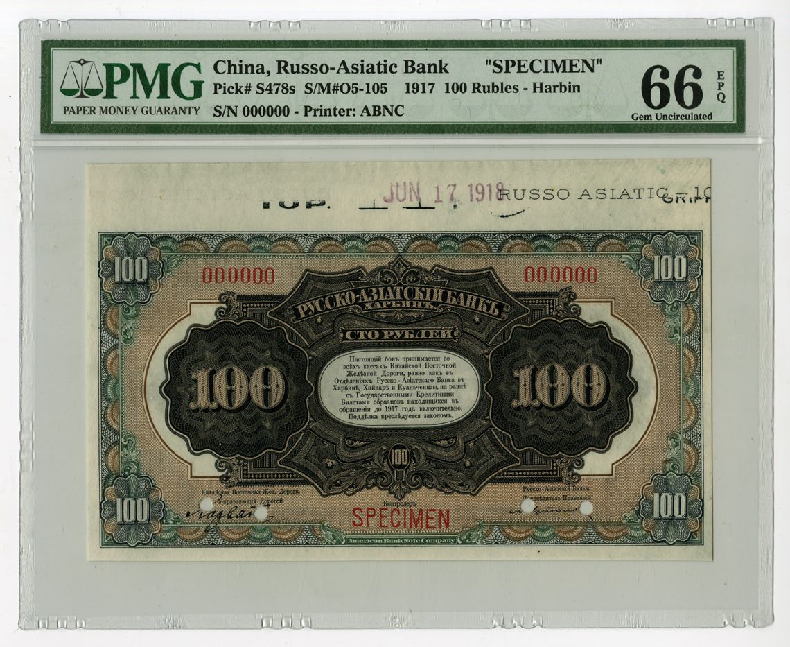 Harbin, China. 1917. 100 Rubles, P-S478s S/M#O5-105, Specimen Banknote, Dark brown on m/c underprint, Back is brown with train in circular frame at center, S/N 000000, PMG graded Gem Uncirculated 66 EPQ with Comments "Printer's Stamp" and "Note Unaffected by Issue in Selvage," ABNC. Tied as highest graded out of 15 graded in the PMG census.